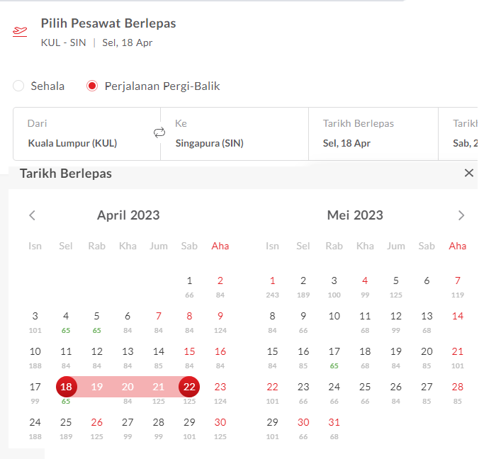 Contoh harga terkini daripada carian di Airpaz.com untuk laluan KL ke Singapore pada bulan April 2023 (carian ini dilakukan pada Feb 2023) adalah seperti Gambarajah 1 dibawah.