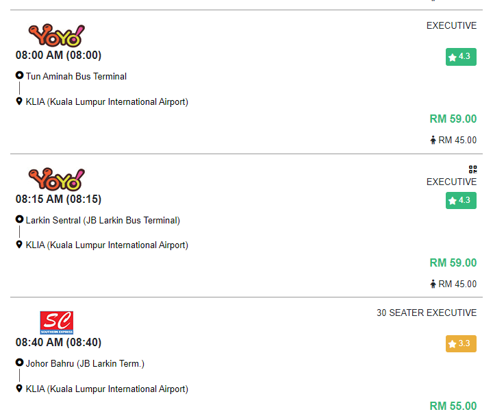 Ipoh to KLIA2 | 8:00AM, 9:00AM, 10:00AM, 2:00PM, 4:30PM, 6:30PM, 9:30PM, 11:00PM, 12:00AM, 1:00AM, 2:00AM, 3:00AM, 4:30AM, 6:00AM, |