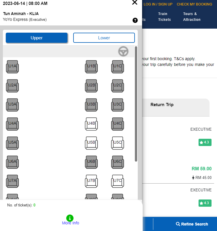 2.1 A detailed view of the bus travel schedule will be presented as below based on your travel search in Step 1. You can choose YoYo Express or other bus operators that are displayed.